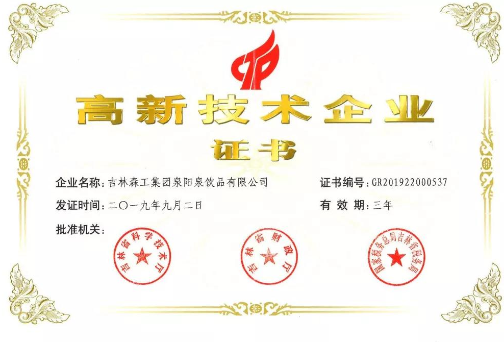 ? ? ? 根據(jù)科學(xué)技術(shù)廳、吉林省財(cái)政廳、國(guó)家稅務(wù)總局聯(lián)合頒布的《關(guān)于公布吉林省2019年第一批國(guó)家高新技術(shù)企業(yè)認(rèn)定結(jié)果的通知》,經(jīng)過(guò)層層審核,吉林森工集團(tuán)泉陽(yáng)泉飲品有限公司由吉林省科學(xué)技術(shù)廳、吉林省財(cái)政廳、北京市國(guó)家稅務(wù)局、國(guó)家稅務(wù)總局吉林省稅務(wù)局局聯(lián)合批準(zhǔn)下發(fā)的高新技術(shù)企業(yè)認(rèn)定。